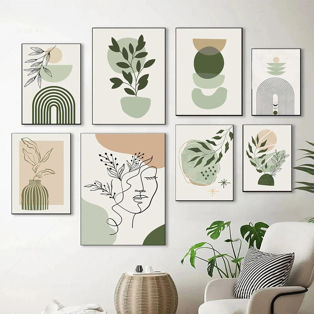 Boho Sage Green Plants Posters Abstract Artwork Geometric Wall Art Canvas Painting Nordic Art Poster Living Room Home Decor