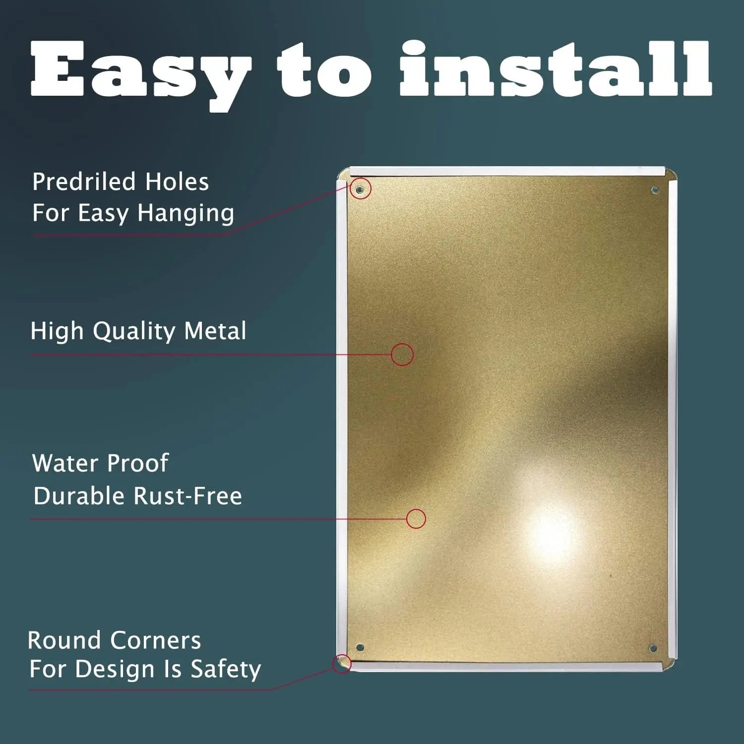 Wonderful design: our tin sign has beautiful printing and it's very clear and has bright color. And this metal sign has four Pre-Drilled Holes, which can easy to hang, and there are crimping, so it won't fall easily.